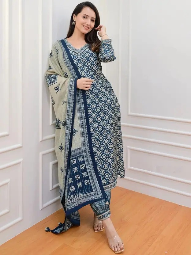 Women Cotton Blend Kurta Pant Dupatta Set